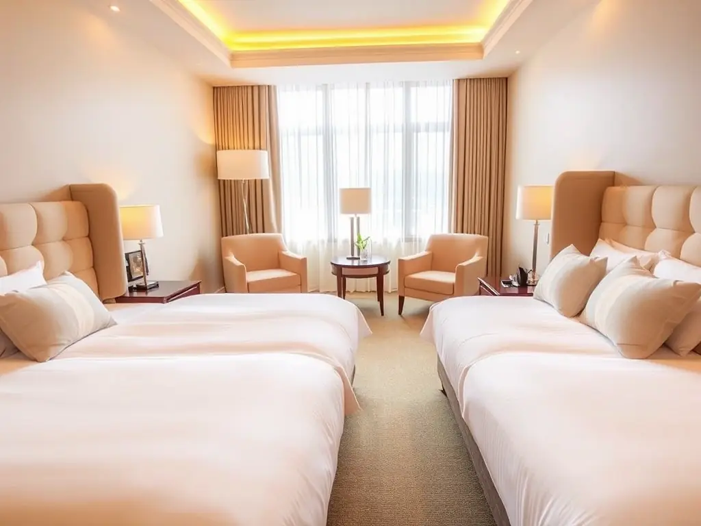 A cozy, inviting hotel room with twin beds, bathed in warm, golden light, suggesting an affordable and comfortable travel experience for couples seeking separate sleeping arrangements.